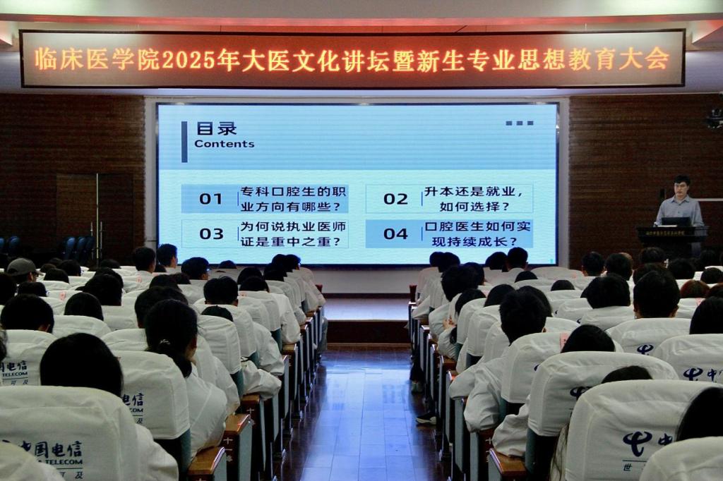 新闻网讯(通讯员 王一哲 涂诗宇)为帮助医学新生筑牢专业信仰、明晰成长方向,传承大医精神。近日,我院以“新生专业思想教育暨大医文化讲坛”为载体,创新采用“专业教师+基层优秀校友”双讲模式,邀请校内专业教师与扎根一线的优秀校友同台分享,从专业认知与职业实践双维度,为新生送上一场兼具思想深度与实践温度的医学启蒙课。本次大会按专业分设两个会场:临床医学专业在312阶梯教室,口腔医学专业在校学术报告厅。