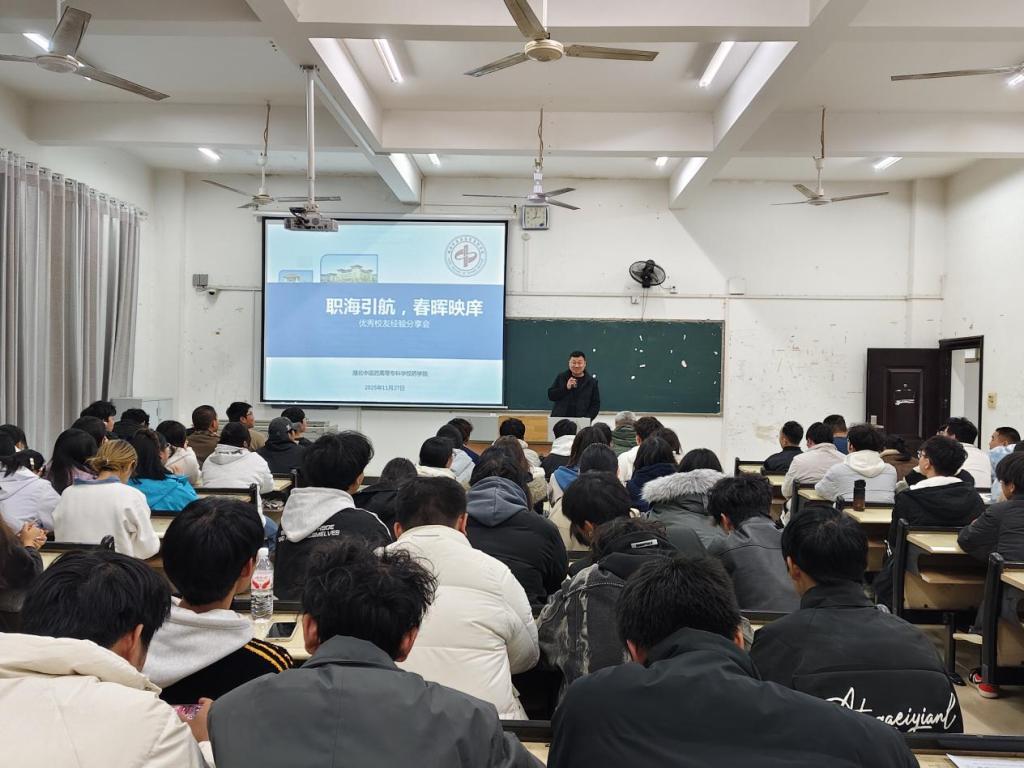 新闻网讯(通讯员 水忻怡 杜雯雯)为帮助学生明晰职业发展方向,科学规划学业与职业生涯,药学院于2025年11月27日19点在医专教学楼510教室举办“职海引航,春晖映庠”优秀校友经验分享会。活动邀请09级医用电子仪器与维护专业优秀毕业生招商局集团人福医药医用耗材部总监艾昊、美敦力医疗集团湖北销售经理王豪、赛力医疗集团华中区销售总监陈义、崇阳县第二人民医院设备科科长石文鹏四位优秀校友担任主讲,药学院党总支副书记罗艾明主持,2024级、2025级智能医疗装备技术专业全体学生参加。