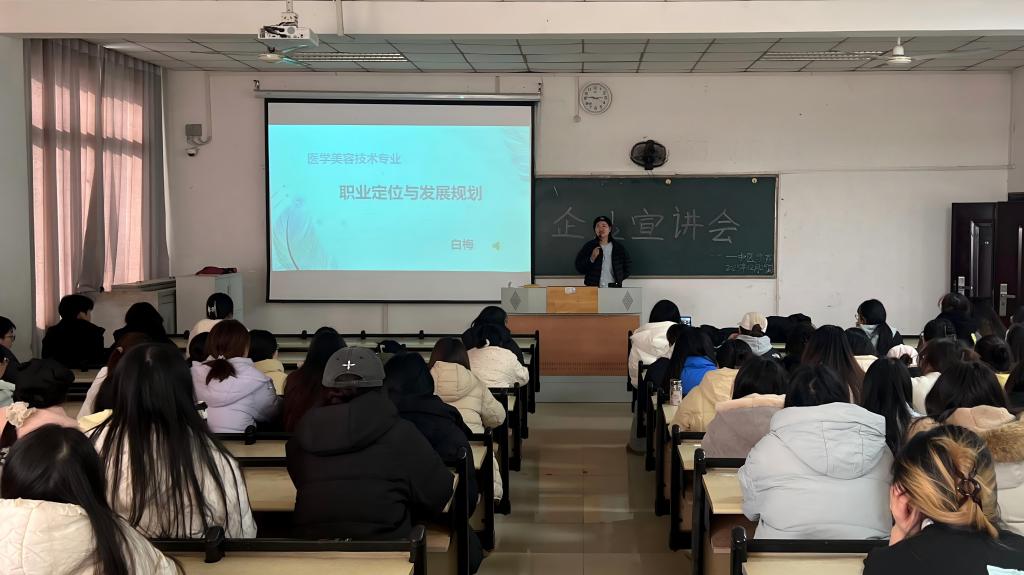 新闻网讯(通讯员 朱小玉 高梓琦)为深化校企合作,切实提升医学美容技术专业学生的职业认知与就业能力,2025年12月25日下午,中医学院在605教室成功举办“美业职场启航”专题企业宣讲会。本次宣讲会特邀武汉九龙弘美化妆品有限公司资深职业导师白梅担任主讲,聚焦医学美容行业发展趋势与人才需求,为同学们带来了一场兼具深度与广度的职业规划指导。