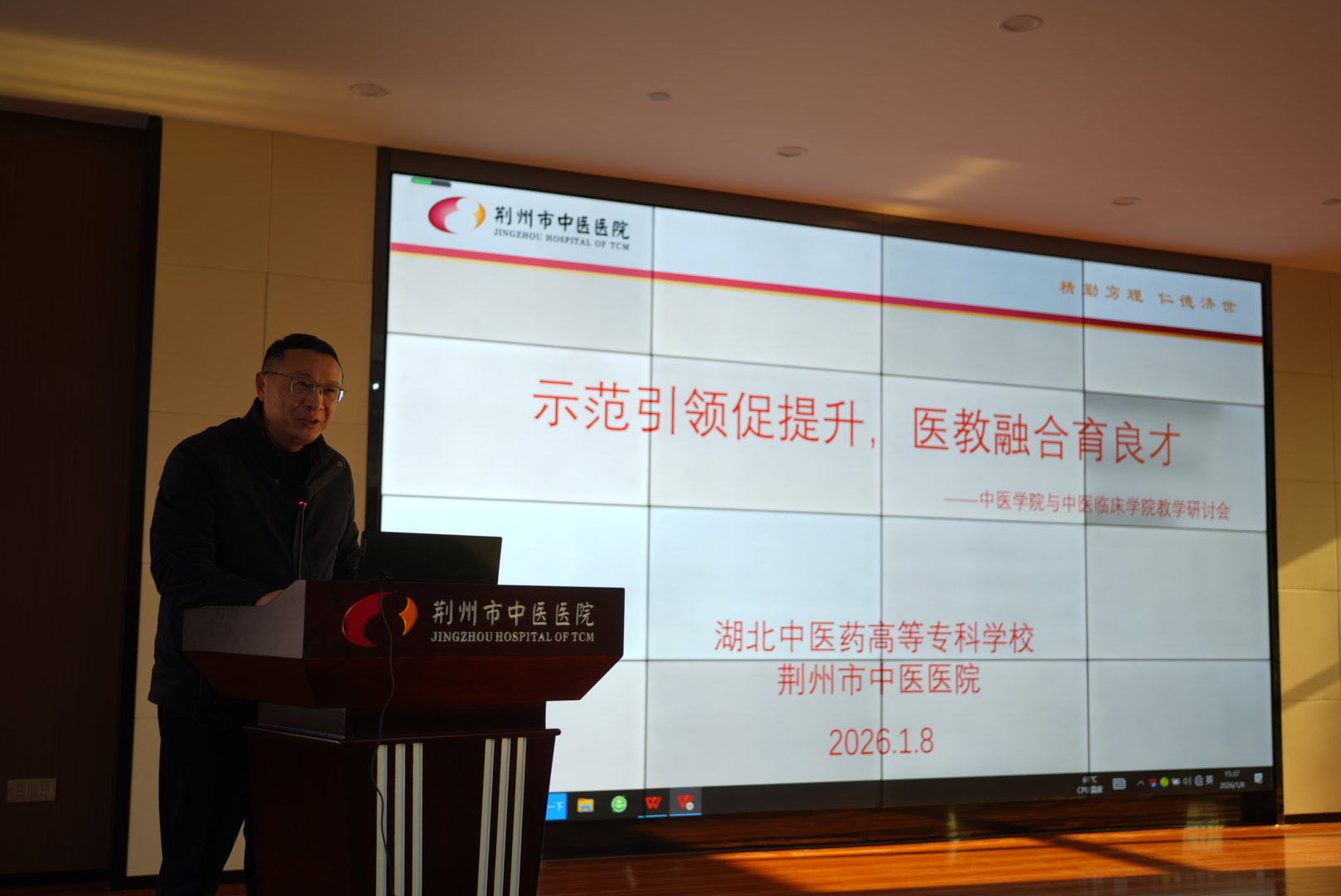 新闻网讯(通讯员 杜相宇 白冰怡)为深入贯彻医教协同、产教融合教育理念,破解中医教学与临床衔接壁垒,1月8日下午,中医学院与中医临床学院在荆州市中医医院仁济楼709学术报告厅联合举办“示范引领促提升,医教融合育良才”主题教学研讨会。中医学院院长孙权、党总支书记杨敬博、副院长黄万凌,中医临床学院院长张朝驹及双方骨干教师、教学管理人员共百余人参会,会议由中医临床学院副院长李琳主持。